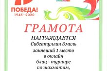 Учащийся 2 класса Сибгатуллин Э. занял I место в онлайн блиц-турнире по шахматам, посвящённом 75-летию Победы в Великой Отечественной войне среди мальчиков.