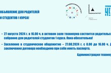 27 августа 2024 г. в 16.00 ч. в актовом зале техникума состоится родительское собрание для родителей студентов 1 курса. Явка обязательна!