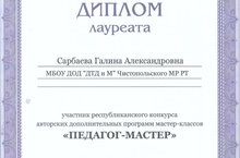 Поздравляем Сарбаеву Галину Александрону, которая стала лауретом конкурса авторских дополнительных программ мастер классов "Педагог Мастер".