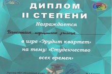 22 марта прошла игра «Эрудит квартет» на тему «Студенчество всех времен». В ней приняла участие команда студентов из Чистопольского медицинского училища. По итогам пройденных заданий наши студенты заняли второе место.
