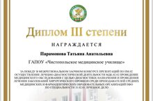 Преподаватель специальных дисциплин Парамонова Т. А приняла участие в межрегиональном заочном конкурсе презентаций по ПМ 02 Осуществление лечебно-диагностической деятельности по специальности 31.02.01.Лечебно дело. Награждена дипломом III степени. Молодчина!