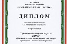 Хор творческой студии "Пульс" Чистопольского медицинского училища принял участие в фестивале студенческих хоров "Мы разные, но мы - вместе2 и получил диплом специальной номинации "За творческий энтузиазм".