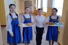 Учащиеся 5-х и 6-х классов в Русско-народных костюмах поздравили всех учеников и сотрудников школы. Пели песни, говорили добрые пожелания и угощали вкусными блинами!