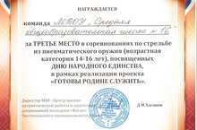 Поздравляем! Наша команда заняла III место в соревнованиях по стрельбе из пневматического оружия, посвященных Дню народного единства, в рамках реализации проекта "ГОТОВЫ РОДИНЕ СЛУЖИТЬ". МОЛОДЦЫ!!!