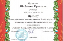 Шабаева Кристина (ученица 9А класса) стала Призером муниципального этапа конкурса детских рисунков антикоррупционной направленности в номинации рисунок в возрастной категории 5-9 класс.