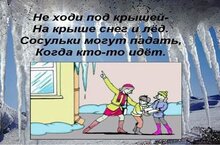 ОСТОРОЖНО СХОД СНЕГА С КРЫШ! 02.02.2022 1. Обильные снегопады и потепление могут вызвать образование сосулек и сход снега с крыш зданий. 2. Сход скопившейся на крыше снежной массы очень опасен! 3. Как правило, такая масса неоднородна по своему составу и содержит как рыхлые массы подтаявшего снега, так и куски слежавшегося льда, зачастую значительного объема и массы. 4. Помните: чаще всего сосульки образуются над водостоками, поэтому эти места фасадов домов бывают особенно опасны. Их необходимо обходить стороной. 5. Соблюдайте: осторожность и, по возможности, не подходите близко к стенам зданий. Если во время движения по тротуару вы услышали наверху подозрительный шум – нельзя останавливаться, поднимать голову и рассматривать, что там случилось. 6. Возможно, это сход снега или ледяной глыбы. Бежать от здания тоже нельзя. Нужно как можно быстрее прижаться к стене, козырек крыши послужит укрытием. 7. Одним из факторов, предотвращающих образование сосулек и сходов снежных масс, является регулярное и своевременное удаление снега с крыш. При отсутствии снега сосулькам просто не из чего образовываться, а значит люди внизу – в безопасности.
