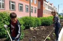 Воспитанники пришкольного трудового лагеря "Пчёлка" облагораживают пришкольный участок. -