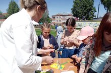 Сегодня, в пришкольном лагере "Юные таланты" прошел «День защиты детей». Ребята с воспитателями в сквере Мельничной площади провели праздничную программу, мастер – классы, спортивные состязания, рисунки на асфальте.