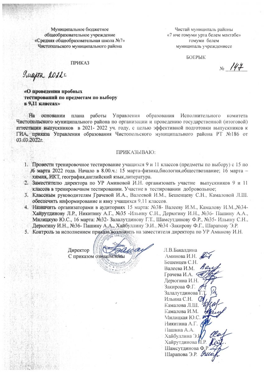 Приказ на проведение тренировочного тестирования в 2021-2022 уч.году среди выпускников 9,11 классов