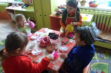 1 Воспитанниками младшей группы сыграли игру «Дочки - матери», мама накормила своих дочек и папу вкусным обедом.
