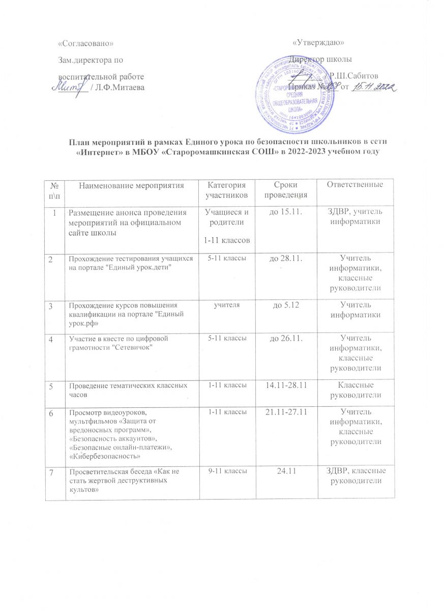 План мероприятий в рамках Единого урока по безопасности школьников в сети Интернет/Интернет челтәрендә укучыларның куркынычсызлыгы буенча бердәм дәрес кысаларында чаралар планы