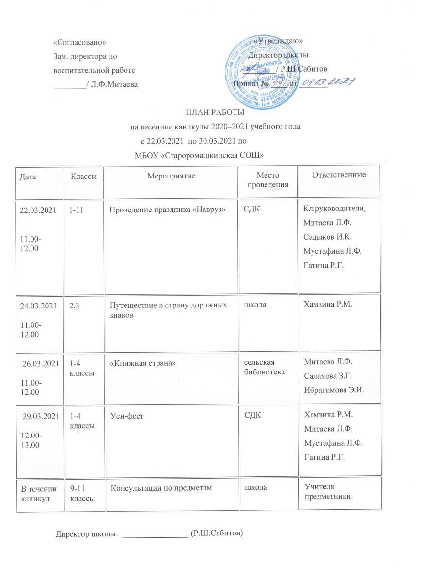 План работы на весенние каникулы / Язгы каникулларга эш планы