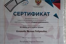 Виртуаль музейларның "уникаль туган як" Бөтенроссия туристлык-туган якны өйрәнү конкурсында "Аларның исемнәрен без хәтердә саклыйбыз"номинациясендә катнашучы сертификаты.
