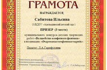 Участвовали в муниципальном детском конкурсе творческих работ "Волшебство конфетного фантика!"для дошкольников 5-7лет в рамках муниципального ресурсного центра «В таланты с малых лет». Ильсина С. занимала 3 место, Лейсан А. получила Сертификат.