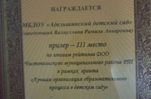 МБДОУ "Адельшинский детский сад" награжден Почетной грамотой МКУ "Управление образование Исполнительного комитета Чистопольского муниципального района РТ" и удостоено III место по итогам рейтинга ДОО Чистопольского муниципального района РТ в рамках гранта "Лучшая организация образовательного процесса в детском саду"