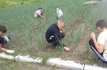 "Дуслык" лагерында балалар суган түтәлләрен утадылар, имән үсентеләренең арасын эшкәрттеләр.
