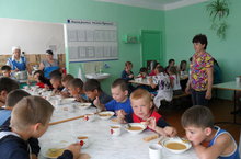 Ашханәдә эшләүче Әлфия һәм Эльмира апалар лагерь балаларын тәмле ашлар белән сыйлыйлар.
