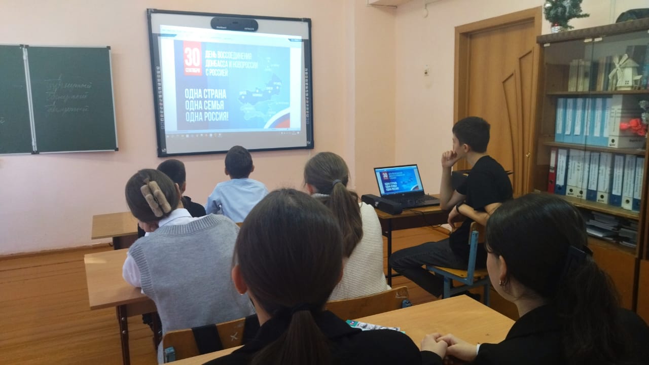 30 сентября в России отмечают День воссоединения Донецкой и Луганской народных республик, Запорожской и Херсонской областей с Российской Федерацией. Этот день отмечают с 2023 года. С тех пор он стал символом исторической справедливости и единства русского народа. В честь этого учитель русского языка и литературы Шайдуллина Р.Т. провела информационный час, где ребята совершили краткий экскурс в историю и узнали о событиях, связанных с вхождением новых регионов в состав Российской Федерации. Также школьники приняли участие в сборе гуманитарной помощи для учащихся Лисичанска и Рубежного.