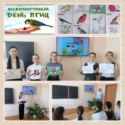 В школе прошло внеклассное мероприятие, посвящённое Международному дню птиц. День птиц – экологический праздник, который отмечается ежегодно в начале апреля. Учащиеся отправились в прекрасный, многообразный мир пернатых с целью выяснить, каково значение птиц в природе и жизни человека.