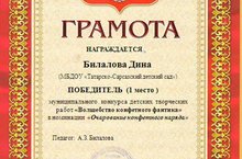Наша воспитанница Билалова Д. участвовала в муниципальном конкурсе детских творческих работ "Волшебство конфетного фантика" и стала победителем l место в номинации "Очарование конфетного наряда"