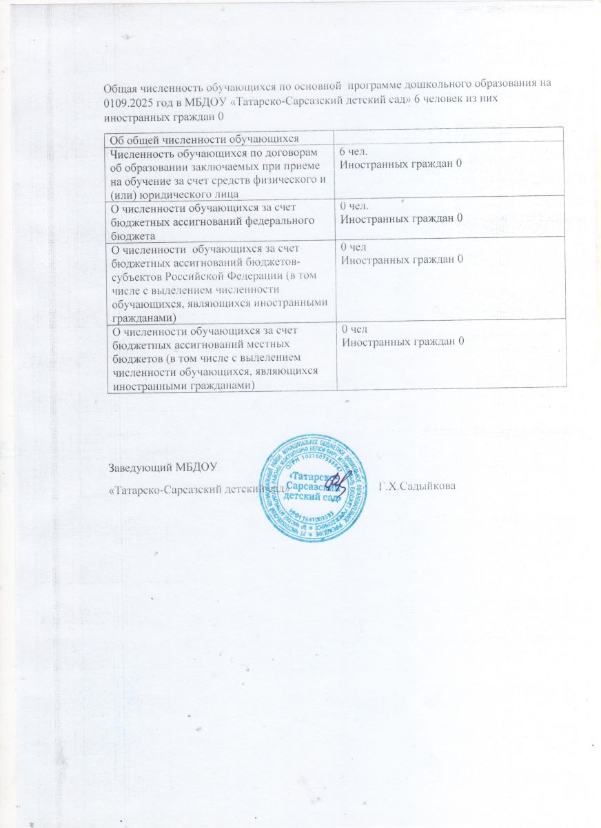 Общая численность обучающихся на 01.09.2025 в МБДОУ "Татарско-Сарсазский детский сад" 6 чел.