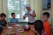 Воспитанники лагеря ознакомились готовыми ручными работами старшеклассников. А сами оформили красивые салфетки для салфетниц.
