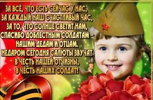 Дорогие коллеги, поздравляем Вас с великим праздником, с Днём Победы! Пусть в нашей жизни всегда будет голубое чистое небо, пусть не узнают наши близкие и дети, что значит война, пусть наши сердца всегда гордятся подвигами наших дедов, пусть песня Победы в каждом из нас пробуждает силу патриотизма и чувства доброй надежды.