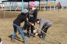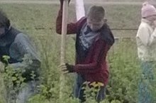 Учащиеся старших классов ухаживают за саженцами смородины.