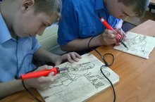 Учащиеся 6-9 классов под руководством учителя Захаровой О.Е. выжигают по дереву картинки, посвященные дню Победы. Свои работы они собираются дарить ветеранам тыла.