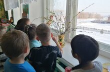 В рамках календарного плана дети наблюдали за ветками березы помещенных в вазу с водой.