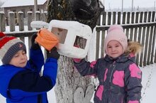 Стайки на крыльцо.В рамках календарного плана, дети во время дневной прогулки насыпали зерно в кормушки.