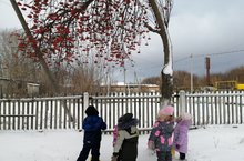 Греться к рябине летят снегири.В рамках календарного планирования, дети разновозрастной группы во время дневной прогулки наблюдали за рябиной.