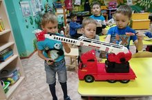 Дети в свободной деятельности рассматривают спецтехнику "пожарную автовышку".