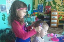 Облик новый создают.Дети разновозрастной группы во время С/р игры "Парикмахерская"