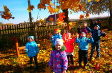 Желтые и красные.Игра с осенними листьями. Дети старше-подготовительной группы во время дневной прогулки.