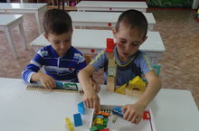 Дети старше подготовительной группы во время игры со строительным материалом.