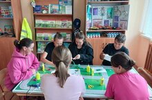 Воспитанники старшей группы собирют в паззлы знаки дорожного движения.