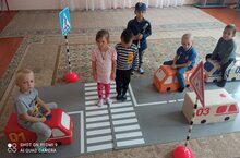 Старшая группа играет в игры "Пешеходный переход" и "Осторожно, Светофор!", специальные машины