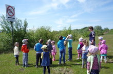 Воспитаниики вместе со взрослыми отправились на экскурсию к местному водоему. Воспитатель просит детей обратить внимание на окружающую обстановку: как и куда идет дорога, куда она поворачивает, что расположено вдоль дороги. Привлекает внимание дошкольников к красоте летней природы. Дети остановились за несколько метров до водоема, полюбовались им издали. Возле воды приятно отдыхать - свежий воздух, легко дышится, глазам приятно смотрть на зелень и воду. Затем воспитатель показывает на знак возле водоема "Купаться запрещено!". Дети всомнили все правила и телефон службы спасения.