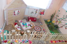 В вестибюле нашего детского сада мы создали уютный уголок под названием "Дружный дворик". Во дворе за одним столом сидят друг против друга татарская и чувашская семьи. В его создании участвовали все: воспитатели, родители, бабушки, дедушки, детишки. При создании композиции были использованы экологически чистые материалы: дерево, бумага, ткань, искусственные цветы, ветка яблони. Детские поделки: арбузики, яблоки, подсолнухи, сушки из пластилина, сделанные на кружке "Умелые ручки".