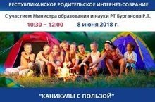 8 июня 2018 года состоится республиканское интернет-собрание с участием министра оборазоания и науки РТ Бурганова Р.Т. на тему "Каникулы с пользой". Приглашаем всех заинтересованных лиц.