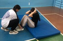 Ученики 8 класса совершенствуют технику выполнения нормативов ВФСК ГТО: прыжок в длину с места, подъем туловища из положения лёжа, наклон и стрельба из пневматической винтовки.