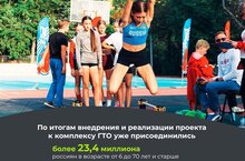 По итогам внедрения и реализации проекта к комплекса ГТО уже присоединились более 23,4 миллиона россиян в возрасте от 6 до 70 лет и старше. Более 14,5 миллиона человек приступили к выполнению нормативов комплекса в центрах тестирования.