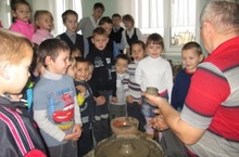 У нас сегодня в гостях гончар , познакомил он нас с гончарным делом . Мы с интересом наблюдали как в его руках обыкновенная глина превращается в какой нибудь красиивый сосуд , свисток , фигурку и .т . д .