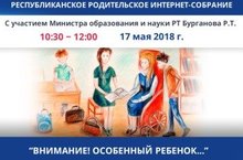 В соответствии с планом работы Министерства образования и науки Республики Татарстан 17 мая 2018 года в 10:30 состоится заседание Республиканского родительского интернет-собрания на тему: «Внимание! Особый ребенок...».