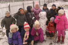 Дети с удовольствием лепили снеговика из первого снега.