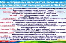 Афиша спортивных мероприятий, посвященных Всероссийскому дню физкультурника в 2024 году. В рамках Дня физкультурника запланирован фестиваль ГТО среди организаций и поселений района.