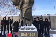 Уборка территории вокруг памятника закреплена за обучающимися нашей школы. Вот и сегодня, волонтеры школы организовали очистку памятника от снега.