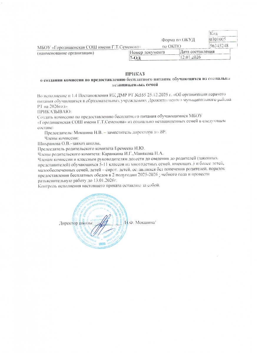 Приказ о создании комиссии по предоставлению бесплатного питания обучающихся из социально незащищенных семей