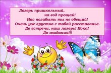 Вот настал и последний день лагерной смены. С утра всем стало грустно. Грустно от того, что мы расстанемся друг с другом . С утра время пролетело так незаметно быстро. Каждый был занят- готовились к концерту. Кто-то репетировал танец, кто-то участвовал в сценке. Затем состоялся наш праздничный концерт. В концерте были интересные сценки про лагерную жизнь, песни, танцы и стихи на летнюю тематику. В общем, было так здорово! А потом мы получили подарки, которые всем детям понравились без исключения. Как хорошо, что есть такие школьные лагеря, как наш, где можно так весело и с пользой для себя можно проводить время! Прощай, Лагерь! До следующего лета!